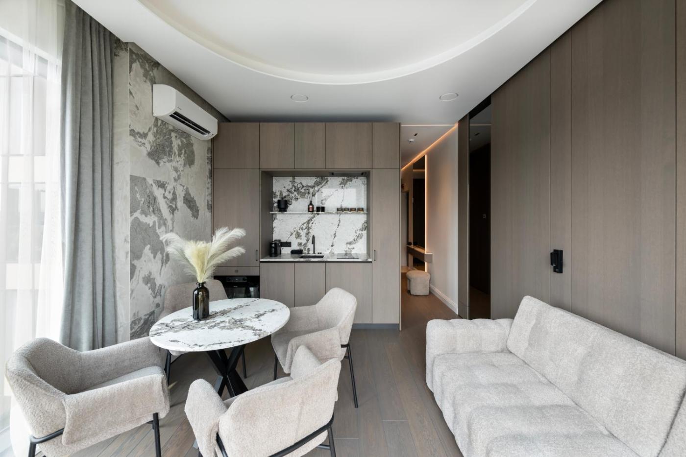One-Bedroom Apartment. This apartments special feature is the fireplace. Featuring a private entrance, this air-conditioned apartment consists of 1 living room, 1 separate bedroom and 1 bathroom with a bath and a shower. Guests can make meals in the kitchen that is equipped with a stovetop, a refrigerator, a dishwasher and kitchenware. The apartment features tiled floors, a seating area with a flat-screen TV, a washing machine, a tea and coffee maker as well as city views. The unit offers 2 beds.