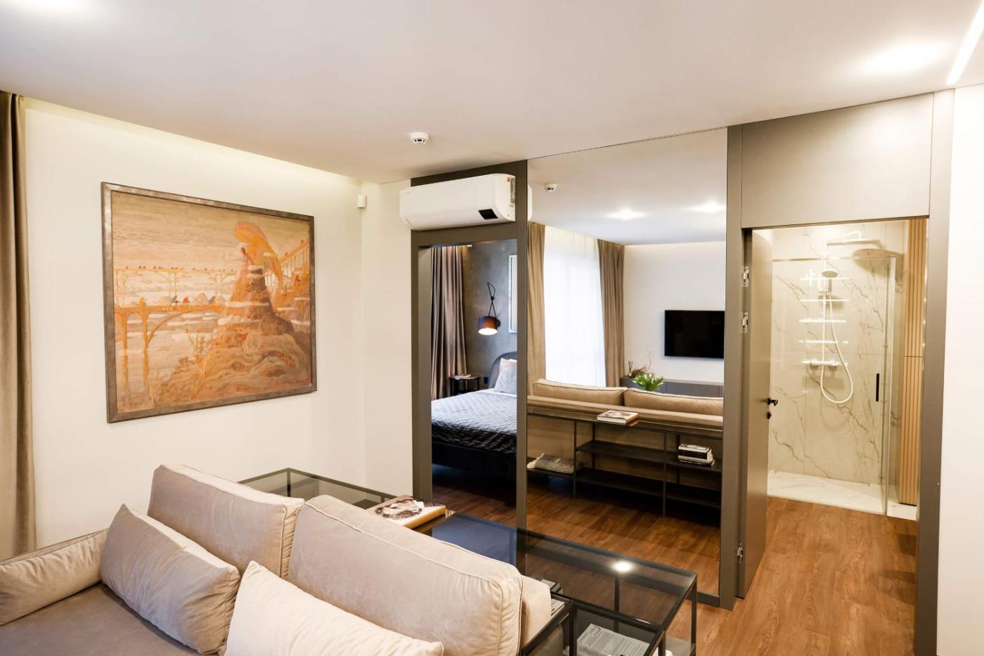 One-Bedroom Apartment. Boasting a private entrance, this air-conditioned apartment features 1 living room, 1 separate bedroom and 1 bathroom with a walk-in shower and a hairdryer. In the well-fitted kitchen, guests will find a stovetop, a refrigerator, a dishwasher and kitchenware. The apartment features a flat-screen TV with streaming services, a washing machine, a minibar, a tea and coffee maker as well as garden views. The unit has 2 beds.