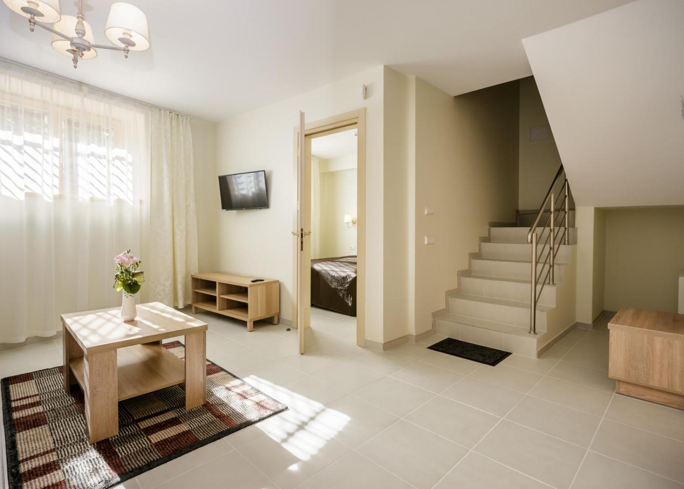 These modern apartments have a seating area with sofas and a kitchenette. Controllable heating available in every room in the winter season.