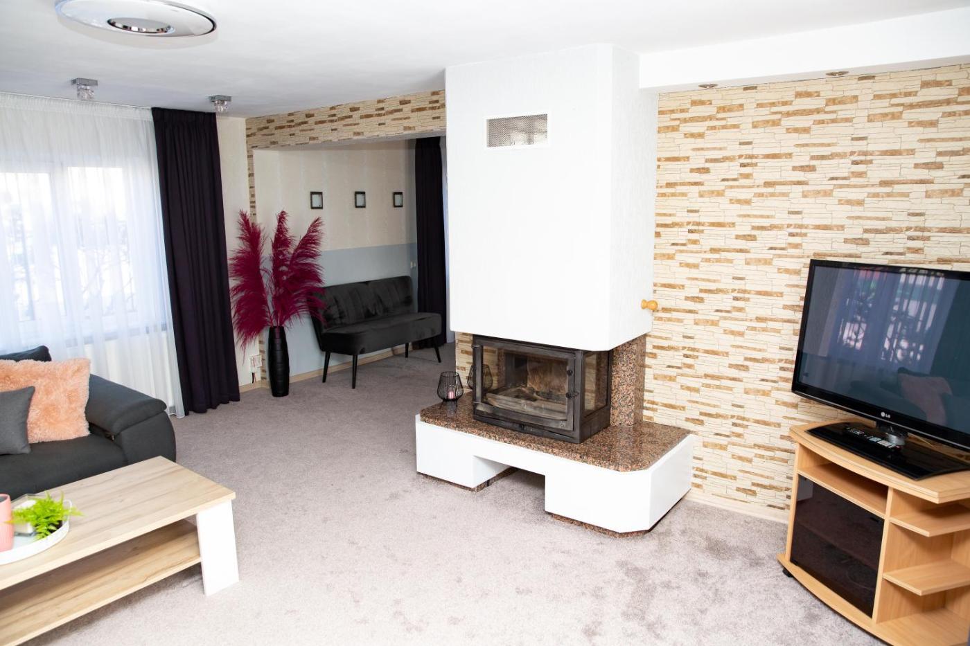 Three-Bedroom Apartment. This apartments standout features are the sauna and fireplace. Featuring a private entrance, this air-conditioned apartment comprises 1 living room, 3 separate bedrooms and 1 bathroom with a shower and a hairdryer. Guests will find a stovetop, a refrigerator, kitchenware and an oven in the kitchen. The apartment also provides guests with a barbecue. The spacious apartment provides a washing machine, a tea and coffee maker, a seating area as well as a terrace with garden views. The unit offers 5 beds.