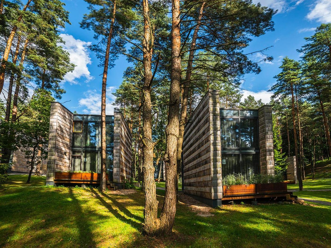 Suite. A duplex suite decorated with the works of photographer Gintaras Česonis and designer furniture by Ligne Roset. The suites have an outdoor terrace with an unforgetable view of the pine tree forest and the lake. ;