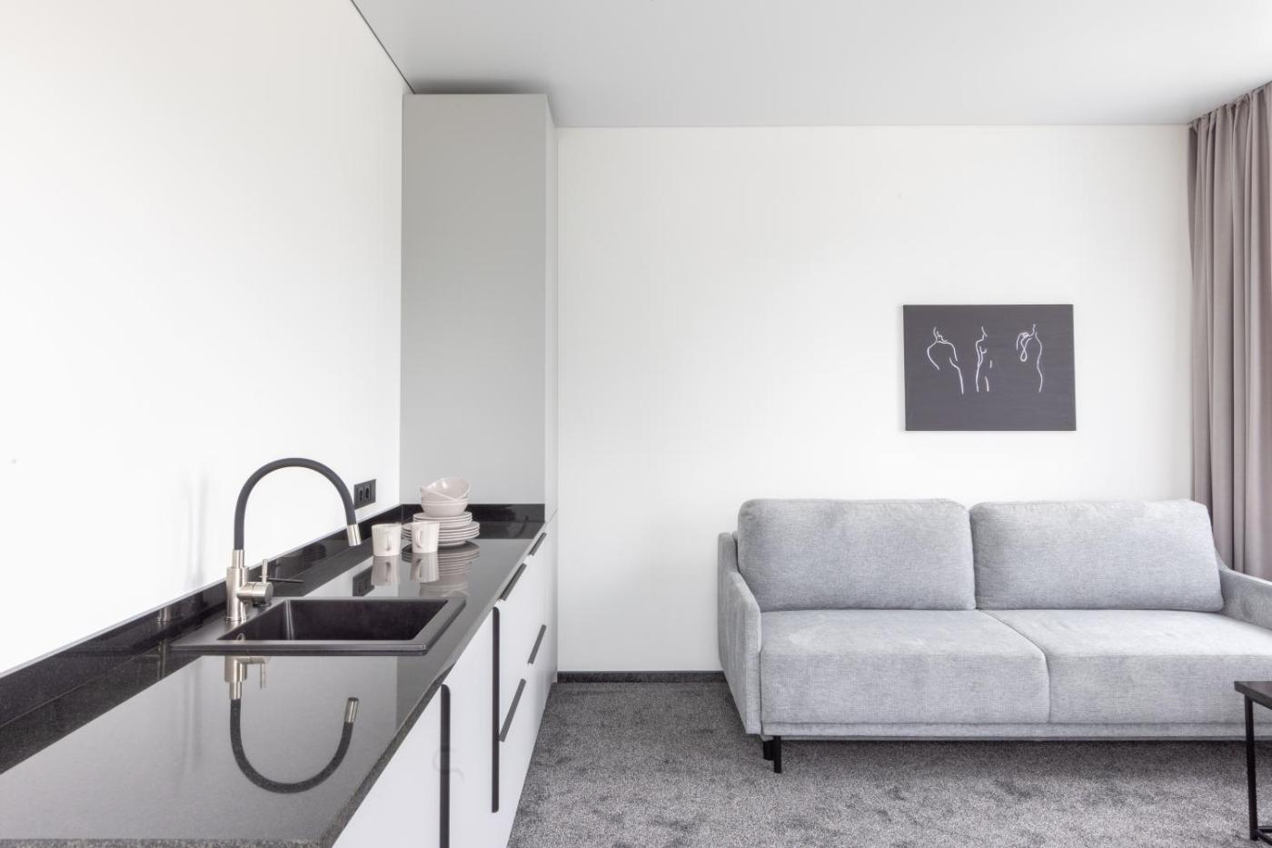 One-Bedroom Apartment. This apartment features 1 living room, 1 separate bedroom and 1 bathroom with a shower and a hairdryer. Guests can make meals in the fully equipped kitchenette that features a refrigerator, kitchenware and a toaster. The apartment has carpeted floors, a seating area with a flat-screen TV, a washing machine, a wardrobe, as well as an electric kettle. The unit has 2 beds. ;
