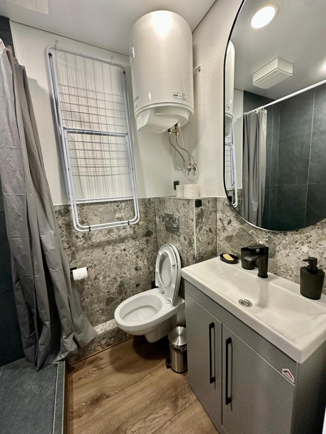 Double Room. The double room offers a washing machine, soundproof walls, as well as a private bathroom featuring a walk-in shower and a hairdryer. In the kitchen, guests will find a stovetop, a refrigerator, kitchenware and a microwave. The double room provides a flat-screen TV, a tea and coffee maker, a dining area, a wardrobe as well as city views. The unit offers 1 bed. ;