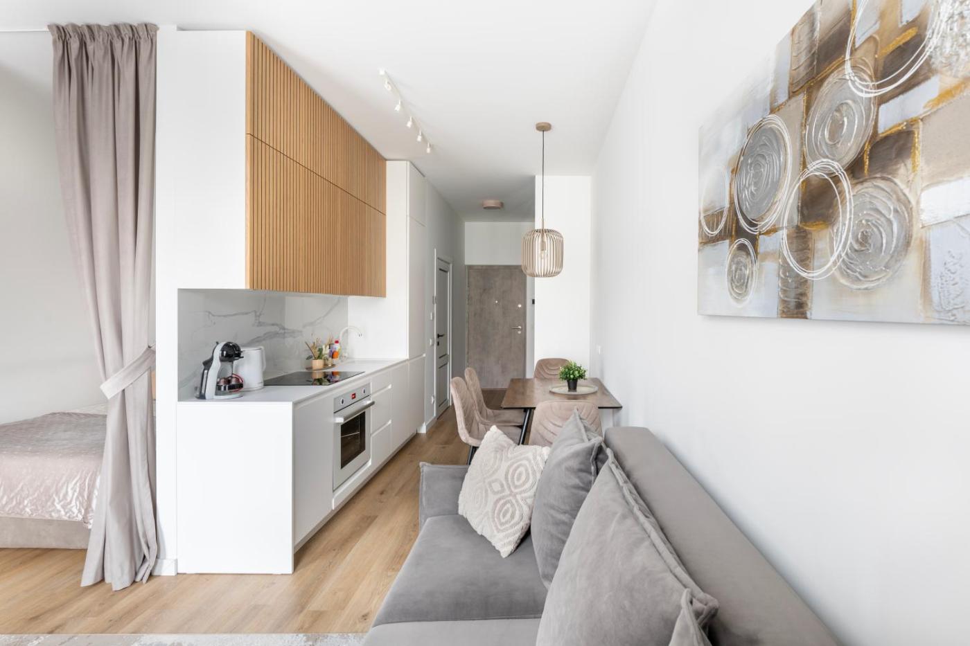 One-Bedroom Apartment. Boasting a private entrance, this air-conditioned apartment includes 1 living room, 1 separate bedroom and 1 bathroom with a shower and a hairdryer. In the kitchen, guests will find a stovetop, a refrigerator, a dishwasher and an oven. The apartment offers a washing machine, soundproof walls, a tea and coffee maker, a flat-screen TV, as well as garden views. The unit has 2 beds.
